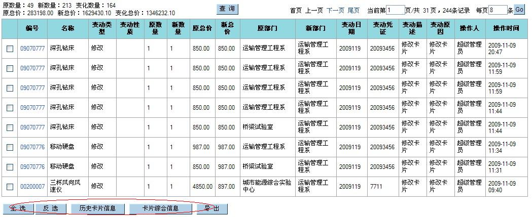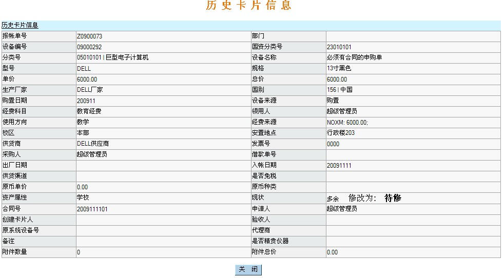二、院系管理员 院系管理员在卡片管理中卡片查询(个人)和变动申请(个人)与普通用户中相同菜单的操作方式相同。而唯一不同的是卡片管理(部门)和变动记录查询(部门)下面对此功能进行一一介绍: 1.卡片管理(部门) 卡片管理(部门):查看的是部门中所有人的记录信息点击“卡片管理(部门)”菜单进入: ![]() 在此列表页面中反选,详情,导出,修改信息,申请报修,申请闲置,院内调拨,申请报废,申请报失与普通用户卡片管理中的卡片查询列表页面中相似按钮的操作一样,而不同的是“打印入帐单”和“打印条码”: (1)、打印入帐单 ![]() 打印入帐单以Excel文件的形式打开或者保存到本地在打开查看。 (2)、打印条码 打印条码与打印入帐单相同都是以Excel文件的形式打开或者保存到本地在打开查看。 2.变动记录查询(部门) 点击“变动记录查询(部门)”菜单进入: ![]() 列表页面中反选,全选与前面相同按钮的操作一样,点击“历史卡片信息”按钮可以查询卡片相关的记录信息点击“卡片的综合信息”到“设备卡片综合信息”页面可以查看卡片的卡片信息,变动记录,维修记录,以及借用记录;导出按钮的操作与前面相似按钮的功能一致。 ![]() 从上图可以看到卡片有变动情况可以从现状态字段中卡片的变动情况 |