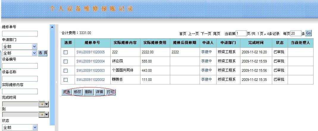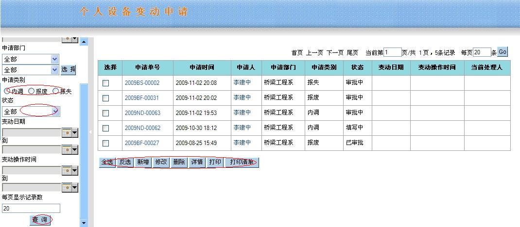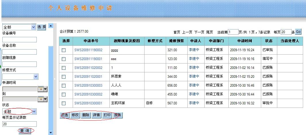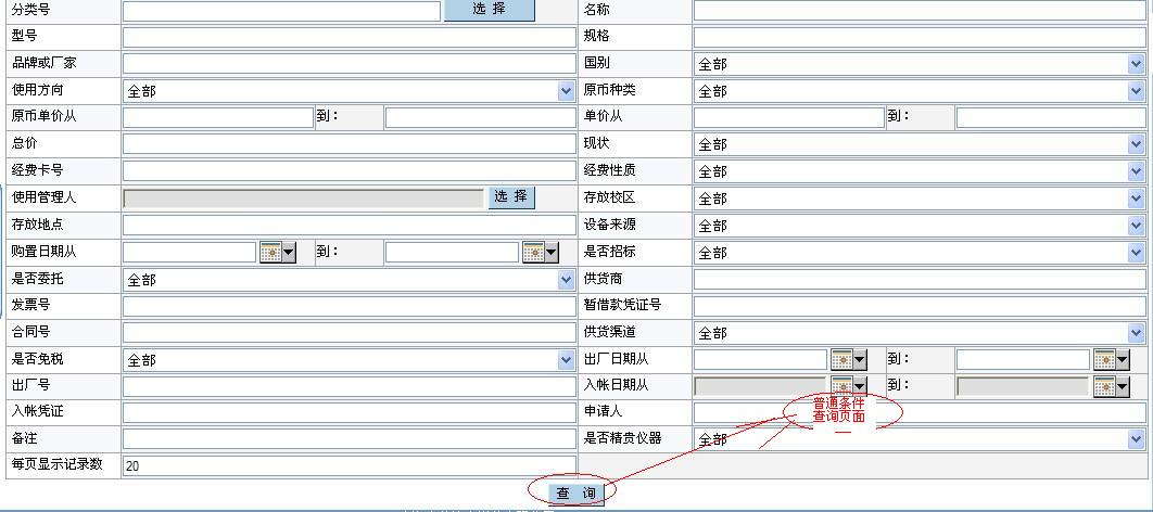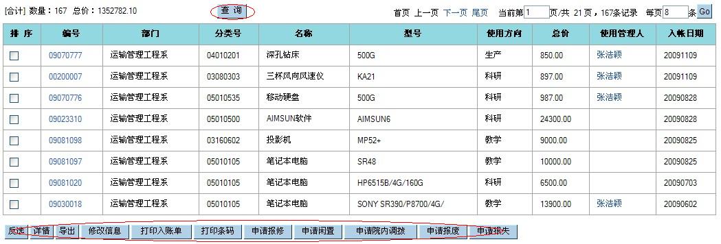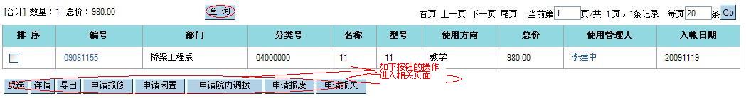 1、卡片查询(个人): 直接通过新增菜单进入: ![]() 在上图页面中您点击“查询”进入: ![]() 在上面的条件查询中您可以按照您需要输入的条件去筛选记录;在列表中最上方您可以点击如果当前为第一页您可以点击“首页”,“下一页”,“尾页”按钮,当前不是首页您可以点击“上一页”,“下一页”,“尾页”,如当前为最后一页则不能点击“尾页”按钮,在每页的输入框中输入数值按照输入的数据点击“GO”去显示;下面对最下方的按钮一一做介绍: (1)、反选 反选:原来选中的点击后变为未选中状态,原来未选中的点击后变为已选中状态。 (2)、详情 详情:点击“详情”按钮和点击每条记录的编号所显示的内容相同,可以查询此条记录的卡片信息,如有变动情况则可以查看变动记录,报帐信息以及申购信息。 (3)、导出 导出:你可以选中记录点击“导出”如图: ![]() 全选:点击后所有的字段为选中状态;反选:点击后字段为未选中状态;保存默认字段:点击后将选中的字段设为模板,在下次将字段进行导出时仍然保留着此字段选中的状态;确定:将所选的字段以Excel的形式打开或者保存到本地在做查看;关闭:退出当前页面,取消对此字段的操作。 (4)、申请报修 在列表页面中点击“申请报修”如下: ![]() 在新增页面中您填写基本信息后点击“保存”将填写的信息进行保存在需要审核在提交,也可以立即的点击“提交审核”系统会在提交审核将填写的信息进行保存。在填写中需要注意的是“红色星好的字段为比填字段!金额:一类的字段为数值类型”,此记录提交审核通过维修单的状态为“已审批”如图: K1、维修申请查询(个人) ![]() 用椭圆标示的是需要注意的地方;(1)、反选 反选:原来选中的点击后变为未选中状态,原来未选中的点击后变为已选中状态 (2)、详情 详情:点击“详情”此记录维修申请单中的基本信息和审批意见以及维修卡片的信息。 (3)、修改 修改:只允许是本人填写的并且维修申请单的状态为“填写中”的记录才可以做修改操作;选中一条填写中的记录点击“修改”进入“修改维修申请单编辑”页面与设备卡片管理中卡片查询(个人)选中一条卡片记录点击“申请维修”所进入的“新增维修申请单”一致。 (4)、删除 删除:反选按钮对其操作有效,选中多条记录进行其删除操作您也可以手工选中记录一条条的进行删除。 (5)、打印 打印:选中您需要打印的记录点击“打印”按钮以Excel的形式打开或者保存到本地在做查看。 (6)、报帐 报帐:已审批的维修申请单此允许对报帐按钮进行操作。 K2、维修报帐查询(个人) 点击“维修报帐查询(个人)”菜单进入如图: ![]() 此页面显示的记录是申请查询(个人)页面中已报帐的才可以在查看,在此页面维修报帐单的状态为“已审批”,其它按钮的操作都与“维修申请查询(个人)”页面的操作一致。 上面介绍了一些在卡片查询(个人)页面中选中记录进行“申请报修”按钮一些列的操作。对此列表页面的其它按钮分别进行介绍: (5)、申请闲置 选中记录点击“申请闲置”按钮到“新增闲置申请”页面填写基本信息进行提交审核,到“设备变动管理”中“闲置申请查询(个人)”中可以查看到在卡片管理中设置为闲置的记录信息,审批通过则闲置申请查询页面中调出申请单的状态为“已审核”,未通过则退出“填写中”,未审批或者正在审批的为“审批中”; (6)、院内调拨 院内调拨:选中记录点击“院内调拨”到“院内调拨”页面填写基本信息进行提交审核后到“内调申请查询(个人)”页面查看此记录的信息。 (7)、申请报废 申请报废:选中记录点击“申请报废”到“申请报废”页面将需要填写的信息填写完整后进行提交审核此后到“报废申请查询(个人)”页面查看相关的记录信息。 (8)、申请报失 申请报失:选中记录点击“申请报失”到“申请报失”页面将必须填写的信息填写完整随后进行提交审核到“报废申请查询(个人)”页面去查看相关的信息。 注意:申请闲置和申请报废以及申请报失中各页面的操作按钮与前相同按钮的操作基本相同。 2、变动申请(个人): 点击“变动申请(个人)”菜单如图: ![]() 在此页面中您可以根据左边的输入条件筛选您需要的记录进行其操作;此页面中国的记录是从“卡片查询(个人)”中对记录进行闲置,内调,报废,报失等按钮进行操作在此页面可以查看相关的记录,由此列表页面中“申请类别”可以查看此记录属于哪种类别。 此页面中的按钮操作与“维修申请查询(个人)”页面相似按钮的操作相同。 注意:生成卡片时分成5种:设备、家具、低值设备、低值家具、附件,单价800元以上的类别编号不是“13”开头的是设备,单价200到800元之间的类别编号不是“13”开头为低值设备,单价500元以上的类别编号是“13”开头的为家具,单价200到500元之间的类别编号是“13”开头为低值家具。 |