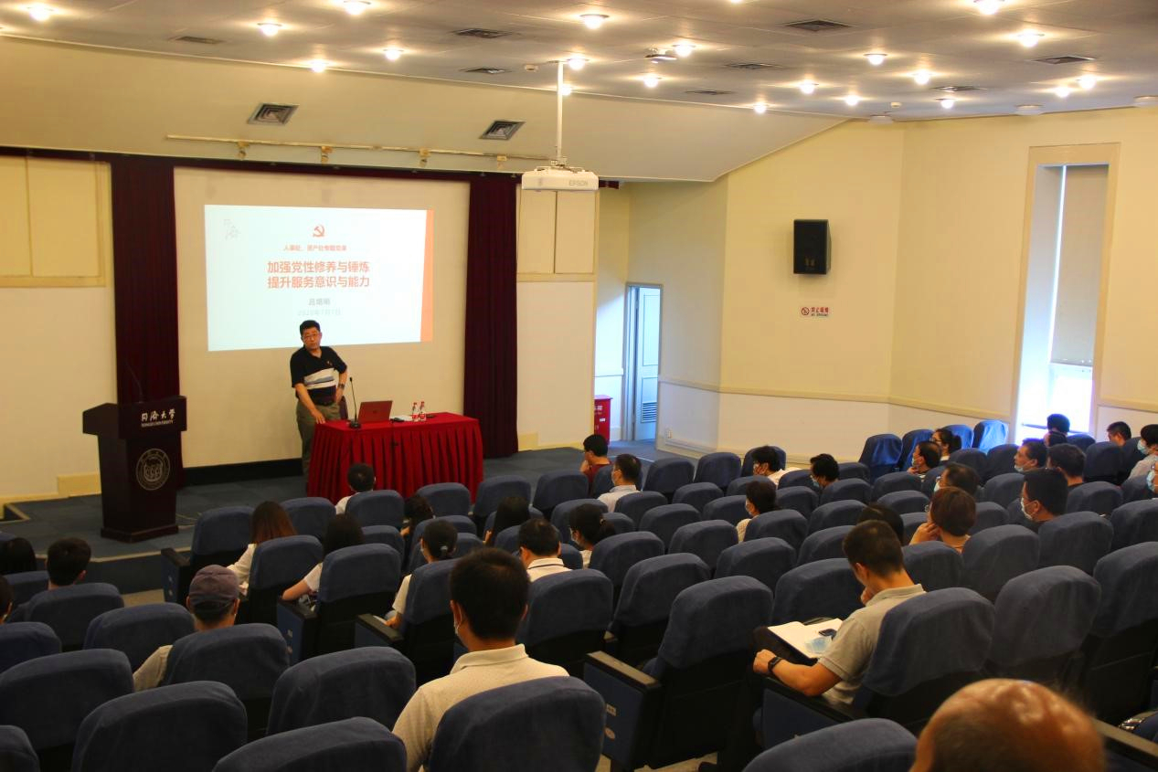 2020年7月7日下午,机关教工第十八支部(教师工作部、人事处)和第二十三支部(资产处、采招办、能源中心)举行联合党课,特邀副校长吕培明教授以“加强党性修养与锤炼,提升服务意识与能力”为主题作专题党课。活动由教师工作部、人事处党支部书记黄雨主持,来自两个支部的67名党员、积极分子参加。