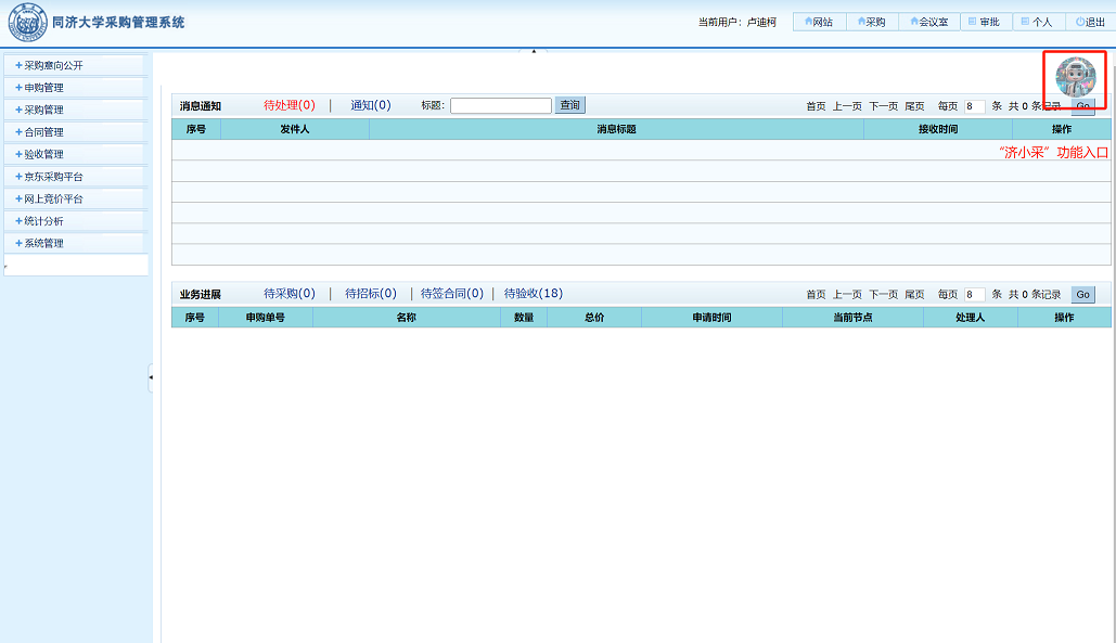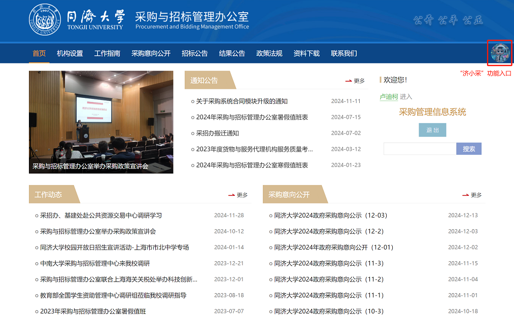 - 同济大学采购与招标管理办公室主网页登录后界面(详见附件一);
